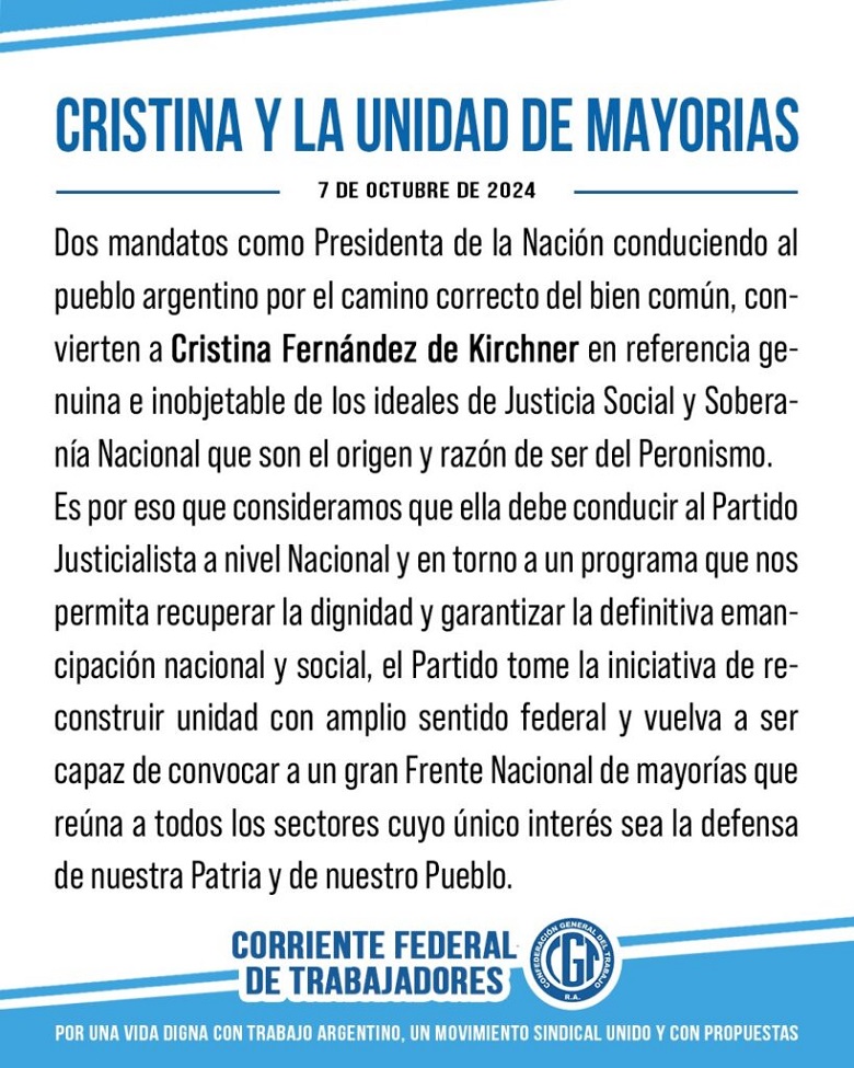 “La Corriente Federal de Trabajadores considera que Cristina Fernández de Kirchner debe conducir al Partido Justicialista a nivel nacional” como la líder necesaria para impulsar “un programa que nos permita recuperar la dignidad y garantizar la definitiva emancipación nacional y social”, apuntó el comunicado. Este llamado a la unidad se alinea con la demanda creciente en el movimiento sindical y peronista de un liderazgo que represente los intereses de los trabajadores y la soberanía del país.