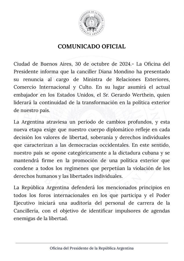 Mirabella, en el proyecto de resolución que presentó ante sus pares del Congreso, salió al cruce del comunicado presidencial señalando “que esto implica un desconocimiento de la trayectoria, idoneidad y capacitación del cuerpo diplomático de nuestro país y un desprestigio que no pretende ser otra cosa que una amenaza indirecta a los que no se encolumnen detrás de las ideas libertarias”.