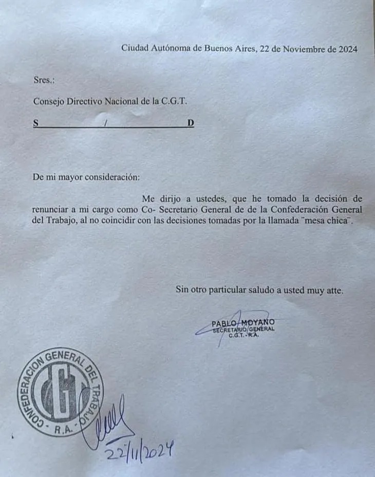 Moyano renunció a su cargo en la CGT a través de una breve nota enviada al Consejo Directivo de la central. Hacía un tiempo que venía pidiendo mantener un plan de lucha contra el ajuste libertario, pero en el último tiempo primó la postura dialoguista.