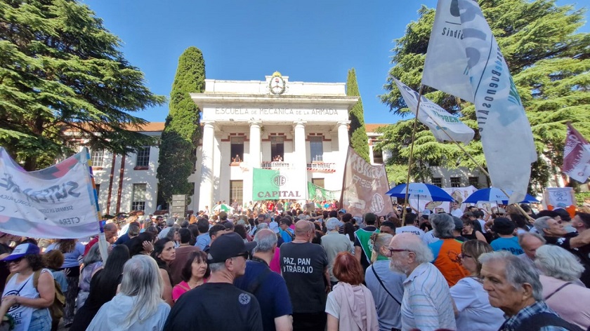 La Asociación Trabajadores del Estado (ATE) se movilizó a la ex ESMA, predio donde también funciona la Secretaría de Derechos Humanos, en protesta por los despidos en el sector y el desmantelamiento de las políticas de derechos humanos durante la gestión de Javier Milei.