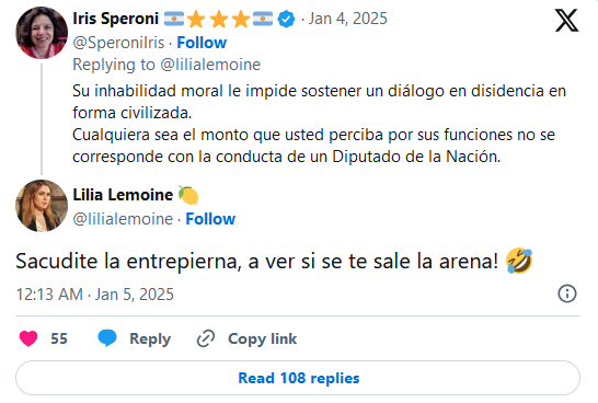 La respuesta de Speroni no tardó en llegar: "1. El insulto está demás, diputada. 2. Agradeceré que busque su recibo de haberes y lo publique. 3. Los diputados no cobran lo mismo. Cada uno tiene una liquidación diferente". A lo que Lemoine replicó: "Sobame la quena, reina".