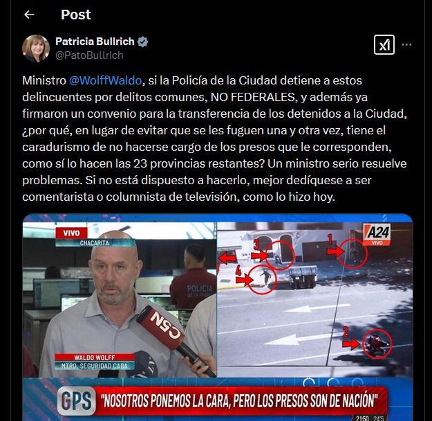 La ministra de Seguridad de la Nación, Patricia Bullrich, cuestionó duramente al ministro de Seguridad de la Ciudad, Waldo Wolff, luego de sus declaraciones sobre la fuga de seis presos de la Comisaría Vecinal 6 A de Caballito. En sus redes sociales, Bullrich le exigió a Wolff asumir responsabilidades y dejó fuertes críticas a su gestión.