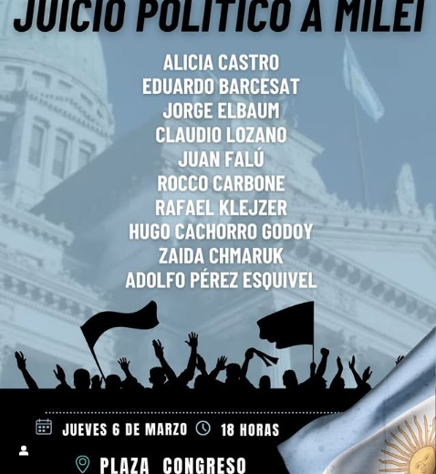 El próximo jueves 6 de marzo a las 18 horas, la Plaza de los Dos Congresos será el escenario de un acto convocado por diversas figuras políticas, gremiales y de derechos humanos, con el objetivo de exigir el inicio de un juicio político contra el presidente Javier Milei. Entre los convocantes se encuentran: