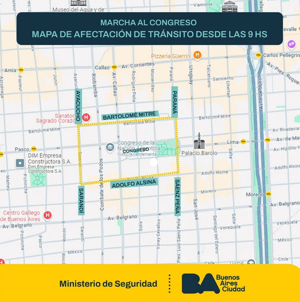 Además, el tránsito permanecerá cortado desde las 9 horas en un perímetro delimitado por las calles Paraná, Sáenz Peña, Bartolomé Mitre, Ayacucho, Sarandí y Adolfo Alsina.