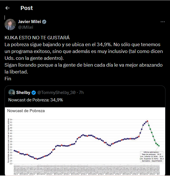 Eufórico por el descenso en el indicador, el libertario planteó: “La pobreza sigue bajando y se ubica en el 34,9%. No sólo que tenemos un programa exitoso, sino que además es muy inclusivo (tal como dicen Uds. con la gente adentro)”.