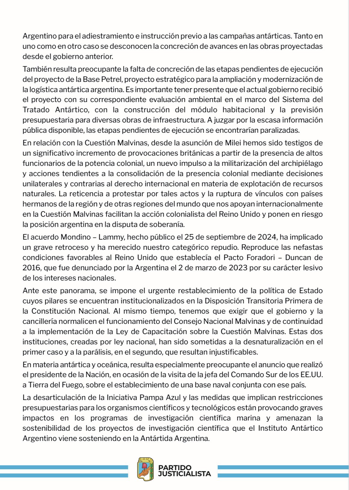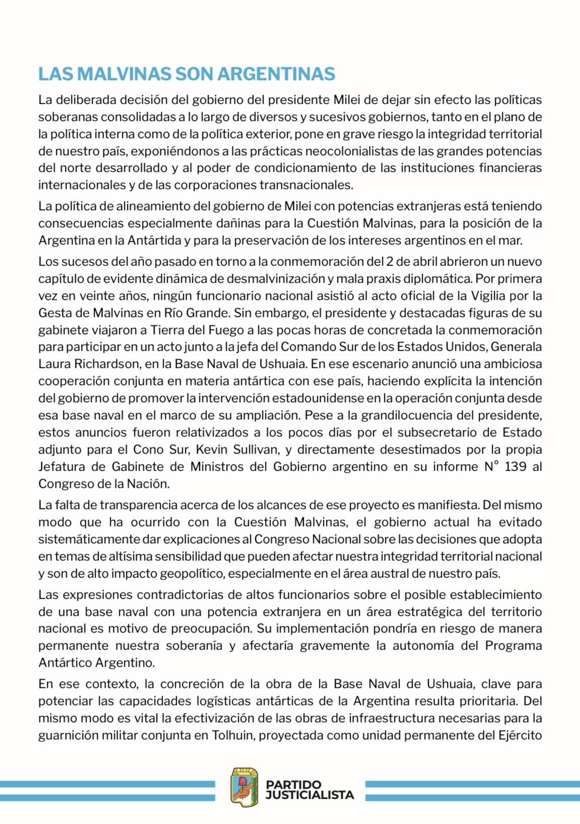 Quiero compartir, este 2 de abril, los últimos tres párrafos del documento elaborado y publicado en el día de la fecha por la Secretaría de Defensa del Partido Justicialista.