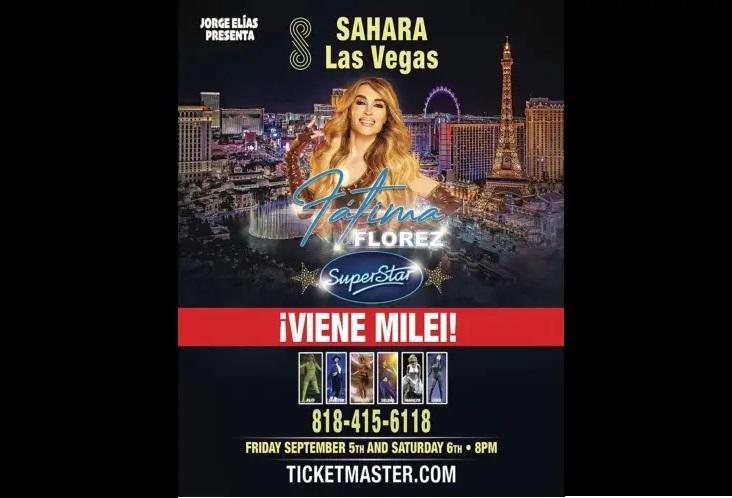 El empresario Jorge Elías promociona el espectáculo de la actriz, bailarina y humorista Fátima Flórez en el Hotel Sahara, de Las Vegas, con la asistencia del presidente Javier Milei, quien este miércoles viajará a Estados Unidos para participar de encuentros empresariales en Los Angeles y en la ciudad famosa por su vida nocturna y casinos abiertos las 24 horas.