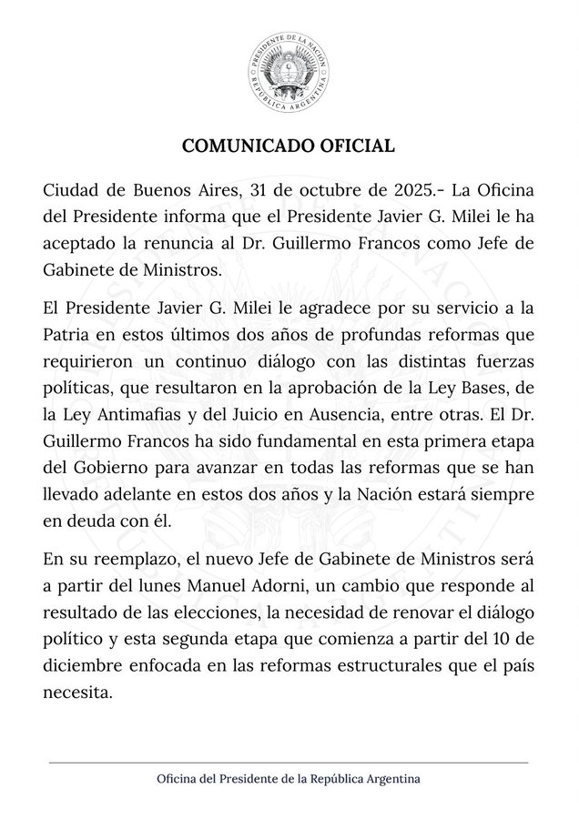 El presidente Javier Milei, le aceptó la renuncia actual jefe de Gabinete, Guillermo Francos. Su lugar será ocupado por el vocero presidencial, Manuel Adorni.