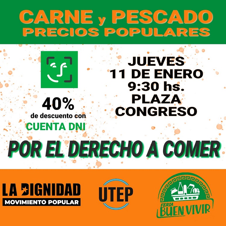 La Unión de Trabajadores de la Economía Popular (UTEP) se hará presente el próximo jueves, desde las 10 de la mañana, en la Plaza de los dos Congresos, donde ofrecerá diferentes cortes de carne y pescado a precios populares, y con un 40% de descuento a quienes abonen con la Cuenta DNI del Banco Provincia.