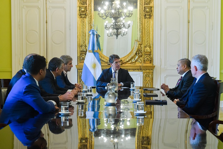 El jefe de Gabinete, Nicolás Posse, y el ministro de Economía, Luis Caputo, encabezaron ayer en el Salón de los Científicos de la Casa Rosada una reunión con el presidente de YPF SA, Horacio Marín; el vicepresidente ejecutivo de Gas & Energía de la compañía, Santiago Martínez Tanoira, y altos directivos de la empresa Petronas. En el encuentro, los ejecutivos de la compañía de Malasia mostraron su interés en realizar una inversión de 180 millones de dólares para la ingeniería del proyecto de Gas Natural Licuado (GNL), clave para el futuro energético del país y que duplicaría la producción actual de Argentina.