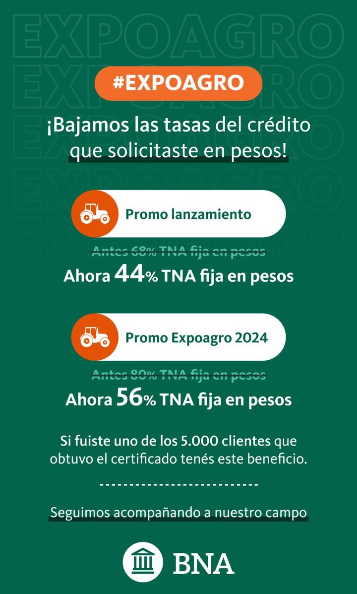 Con el objetivo de mejorar los beneficios de la oferta llevada a Expoagro 2024, el BNA bajó las tasas correspondientes a los certificados de los préstamos en pesos para la adquisición de maquinaria agrícola: pasó de 68 a 44% en el caso de la Promo Lanzamiento y de 80 a 56% en la Promo Expoagro 2024.
