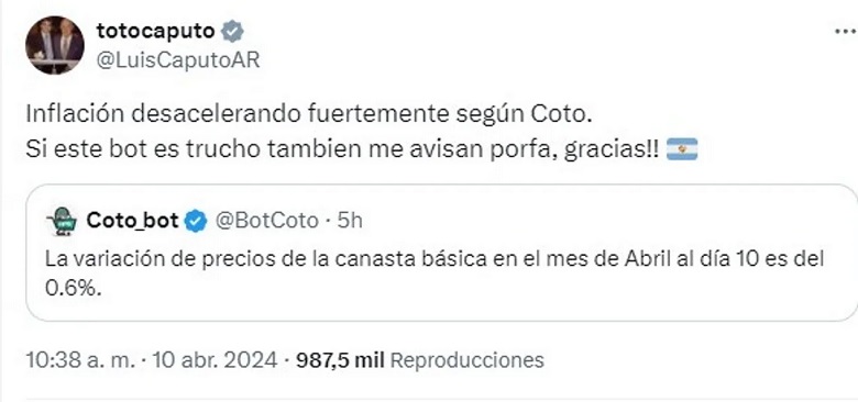 El ministro de Economía, Luis Caputo, utilizó nuevamente un bot como respaldo para afirmar, desde su cuenta de X, que la inflación está “desacelerando fuertemente”.