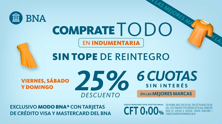 Con el objetivo de reactivar el consumo y promover el acceso a diferentes productos para las familias argentinas, el BNA a través de alianzas con distintas marcas lanzó una campaña de descuentos de hasta el 25% y 6 cuotas sin tope de reintegro para la compra de indumentaria con tarjetas de crédito a través de “MODO BNA+”.