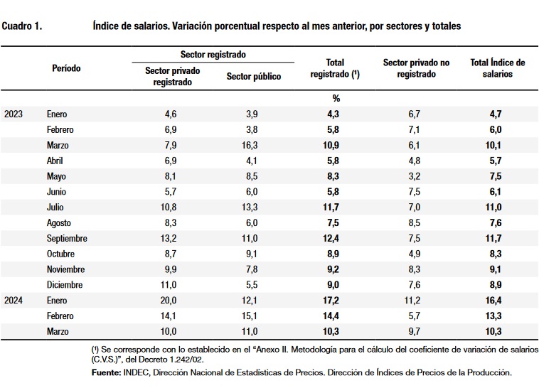 "Luego de una suba real en febrero, los salarios reales del sector privado registrado volvieron a caer en marzo. Esto no sucedió con los salarios reales del sector público, que al igualar a la inflación de marzo, dejaron a enero como el piso de este año", evaluó Argañaraz..