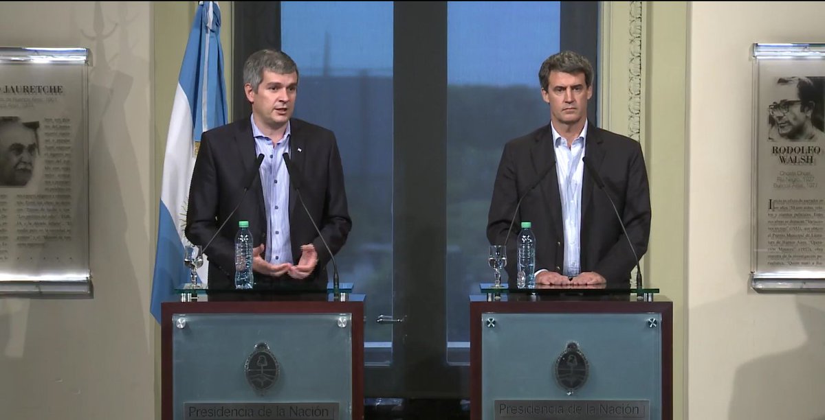 En conferencia de prensa desde Casa de Gobierno, el jefe de Gabinete, Marcos Peña y el ministro de Hacienda y Finanzas, Alfonso Prat-Gay, anunciaron que el Gobierno alcanzó un “preacuerdo” con un grupo de bonistas italianos que no ingresaron a los canjes de deuda del 2005 y 2010.