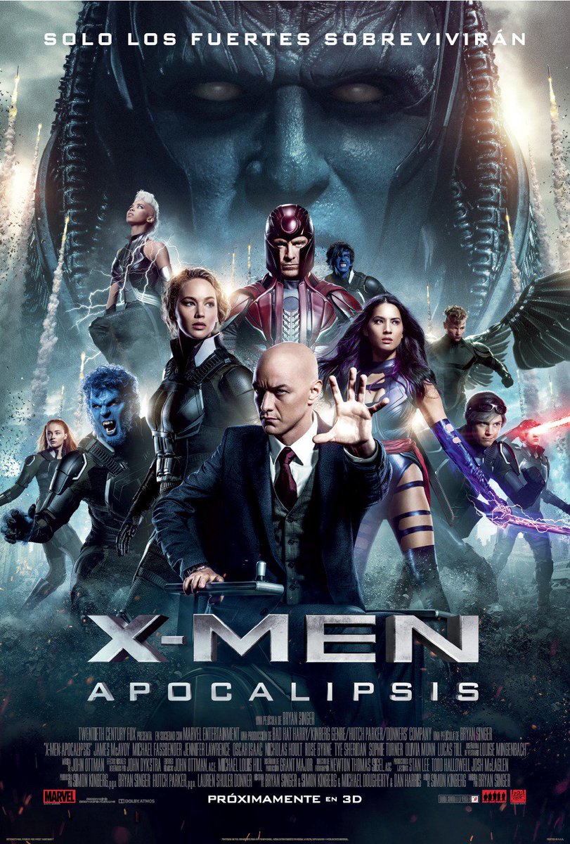 Ficha Técnica: X-Men: Apocalisis (X-Men: Apocalypse 3d, Estados Unidos/2016). Dirección: Bryan Singer Guión: Simon Kinberg, Bryan Singer Fotografía: Newton Thomas Sigel Edición: Michael Louis Hill, John Ottman Música: John Ottman Diseño de producción: Grant Major Elenco: James McAvoy, Michael Fassbender, Jennifer Lawrence, Nicholas Hoult, Rose Byrne, Evan Peters Sophie Turner Distribuidora: 20th Century Fox Duración: 144 minutos
