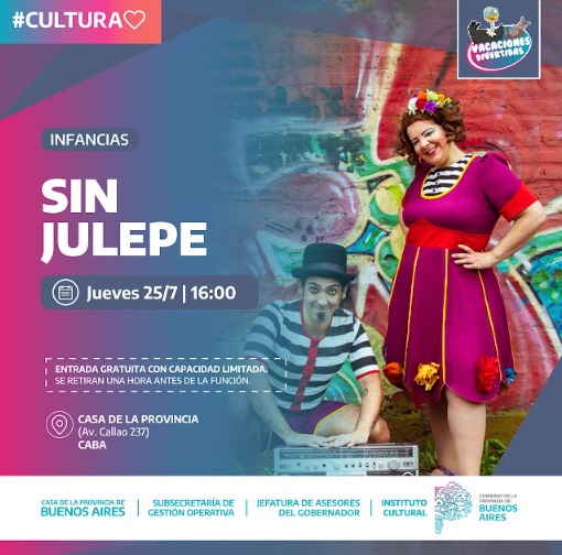 En este marco, el viernes 25 de julio desde las 16 horas en la Casa de la Provincia de Buenos Aires de CABA (Av. Callao 237), se presentará Sin Julepe, dúo que entrelaza la música en vivo, la poesía y la comedia con gran ingenio y destreza. Las entradas son gratuitas y podrán retirarse una hora antes de la función, hasta agotar la capacidad limitada del lugar.