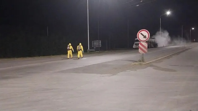 La medida de emergencia se tomó debido al derrame de una carga de ácido clorhídrico sobre el pavimento. Según las primeras informaciones, el conductor habría detectado la pérdida al cruzar por un paso a nivel y al advertir la irregularidad detuvo la marcha. En el lugar trabajan 7 dotaciones de Bomberos Voluntarios de la región y también personal policial y de la delegación local de Protección Civil.