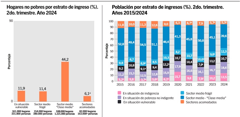 "La expansión de los ingresos laborales y no laborales resulta insuficiente para compensar los aumentos de precios. En consecuencia, las condiciones de vida de los hogares de la Ciudad se deterioran en forma generalizada, afectando el acceso a las canastas básicas y reduciéndose el peso de los sectores medios y acomodados", señala el informe.
