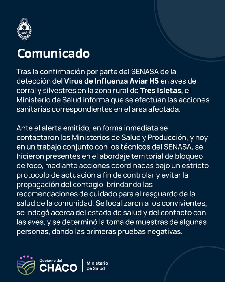 Tras la confirmación por parte del SENASA de la detección del Virus de Influenza Aviar H5 en aves de corral y silvestres en la zona rural de Tres Isletas, el Ministerio de Salud, conjuntamente con esta entidad y la cartera de Producción, efectuaron un abordaje en territorio en el área afectada