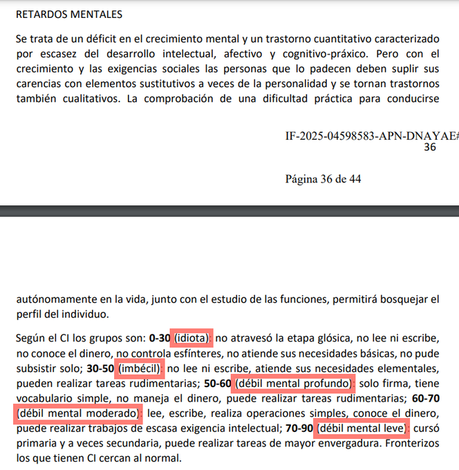 Según detalló, la publicación define a "idiota" a las edades de 0 a 30 años, "imbécil" de 30 a 50 y "débil mental profundo" de 50 a 60. También se menciona la clasificación "débil mental moderado" de 60 a 70 años y "débil mental leve" de 70 a 90 años.