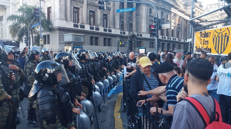 En medio de un fuerte operativo de seguridad, se lleva a cabo este miércoles una nueva marcha de jubilados frente al Congreso. Los manifestantes se congregan sobre la vereda del bar El Molino, mientras llegan las primeras columnas de la Unión Obrera Metalúrgica (UOM) a la Plaza de los Dos Congresos para apoyar el reclamo.