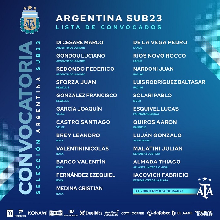 Los citados son: Marco Di Césare, Luciano Gondou y Federico Redondo (Argentinos Juniors); Juan Sforza y Francisco González (Newell 's Old Boys); Joaquín García y Santiago Castro (Vélez); Leandro Brey, Nicolás Valentini, Valentín Barco, Ezequiel Fernández y Cristian Medina (Boca); Lucas Esquivel (Paranaense, de Brasil).