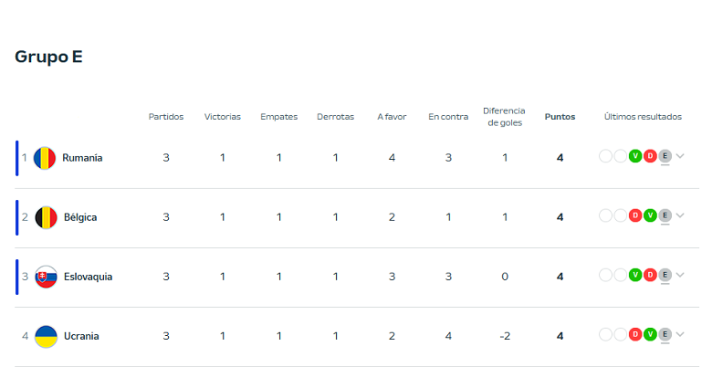 En el caso de Rumania y Bélgica se debió definir al primero por la cantidad de goles a favor, ya que ambos tenían la misma diferencia.