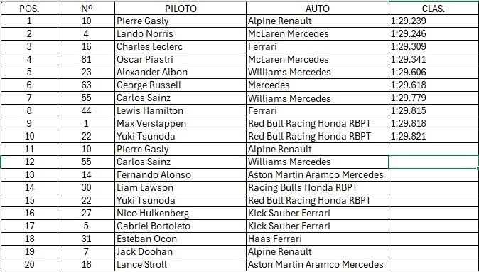 Tercero quedó Charles Leclerc a bordo de la Ferrari, a 70/1000, y detrás el McLaren de Oscar Piastri, que a pesar de un roce con el muro que generó alguna preocupación en el australiano y el equipo de Zak Brown, se ubicó a 102/1000 de Gasly. Luego se escalonaron el Williams de Alex Albon (quedó a 0s367), el Mercedes de George Russell (a 0s379), Carlos Sainz (Williams, a 0s540), Lewis Hamilton (Ferrari, a 0s540), y los Red Bull de Max Verstappen (a 0s579) y Yuki Tsunoda (a 0s582).
