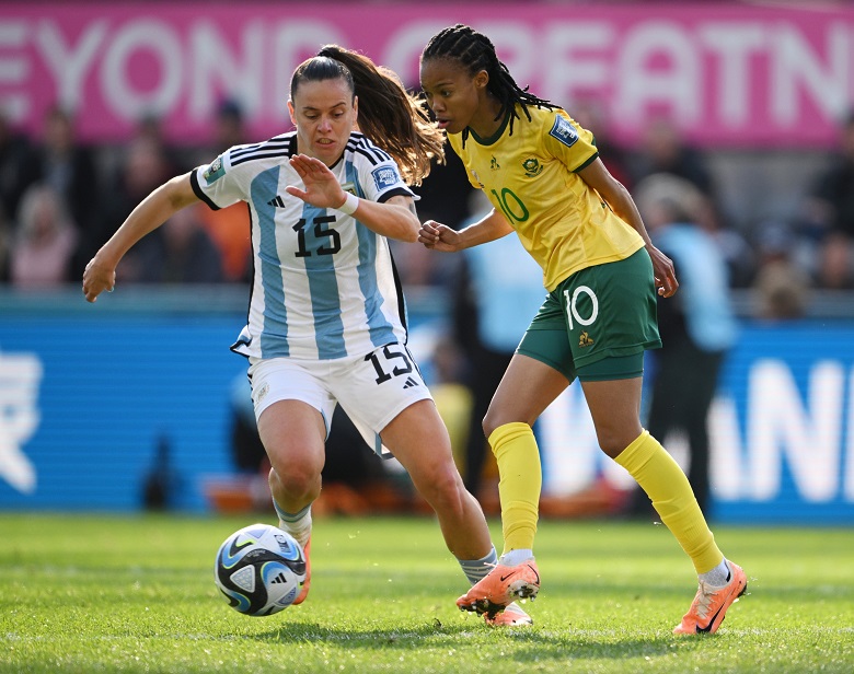 Argentina, con el ingreso de la cordobesa Paulina Gramaglia por Romina Núñez desde el inicio, salió a buscar el arco rival de entrada con un equipo sudafricano replegado y atento para darles la pelota a sus delanteras rápidas, en especial Hildah Magaia (que le había hecho un gol a Suecia) y Thembi Kgatlana.