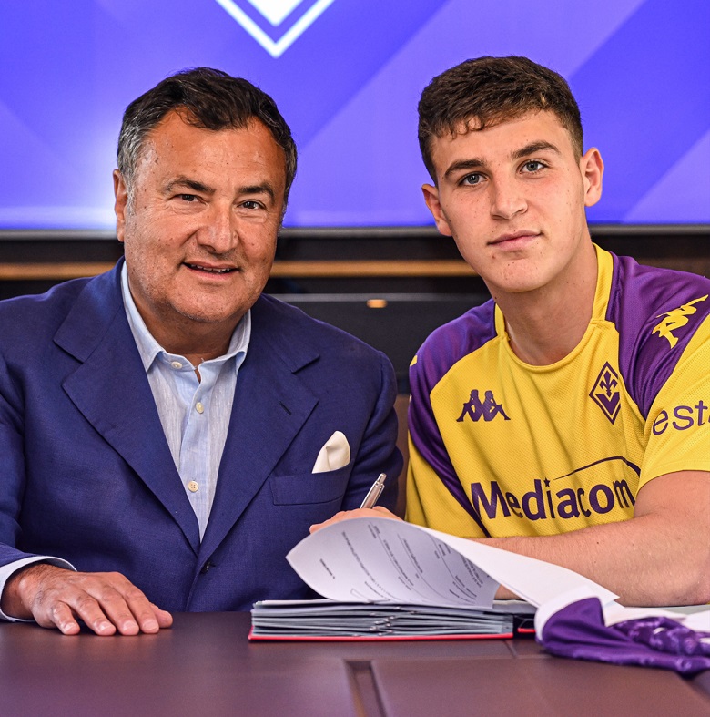 El talentoso volante, de 20 años, firmó un contrato hasta 2028 y posó para los canales oficiales con su nueva camiseta junto a Nicolás Burdisso, exdefensor de Boca Juniors y del seleccionado argentino, y actual directivo del conjunto "viola".