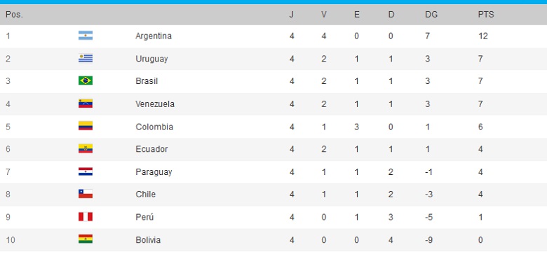 Eliminatorias Sudamericanas: Tabla de posiciones al finalizar la cuarta fecha
