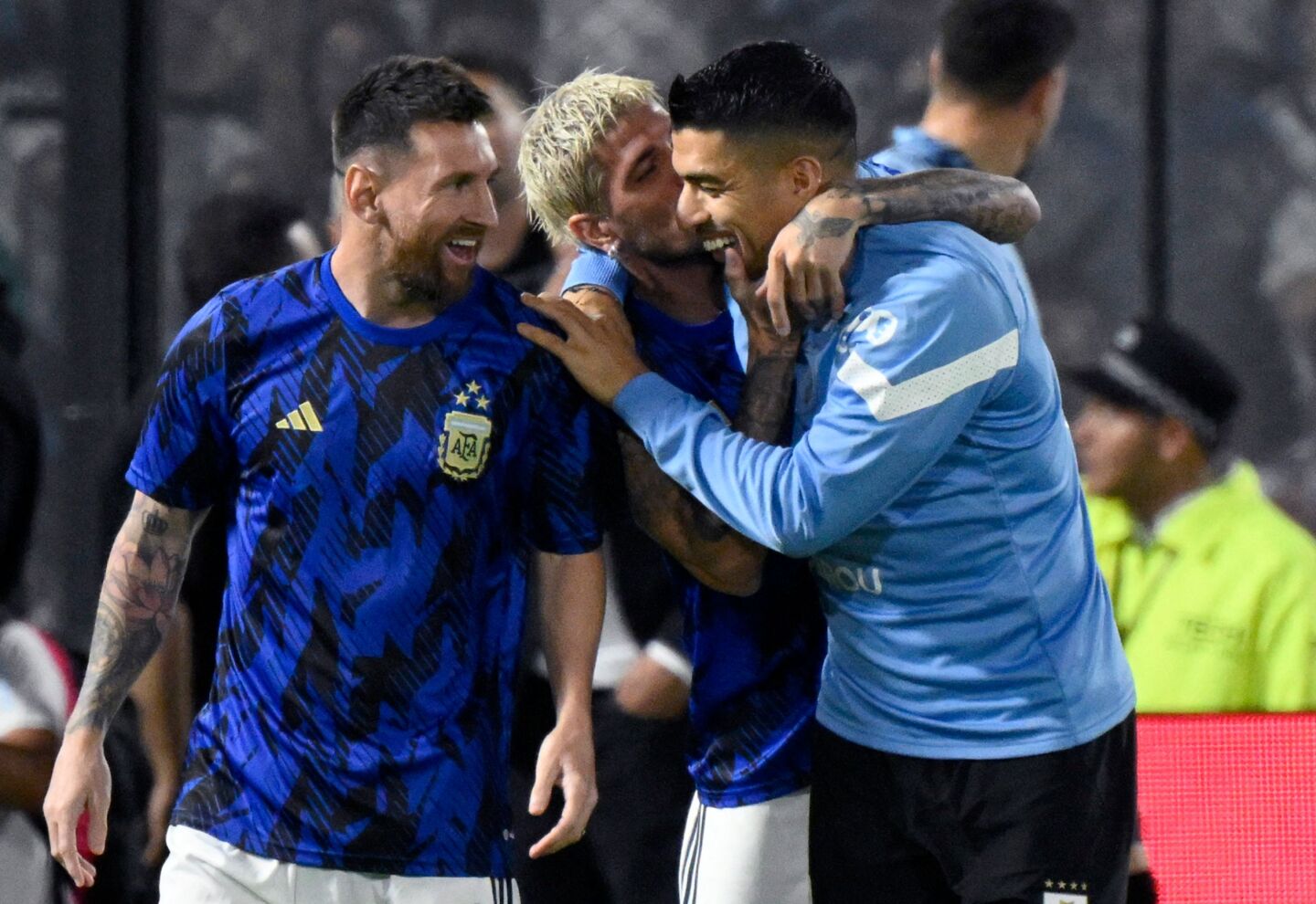 A poco de que comience el clásico entre Argentina y Uruguay en La Bombonera, los dos equipos salieron hacer el calentamiento en el campo de juego y se dio el reencuentro de Luis Suárez con Lionel Messi y Rodrigo De Paul.