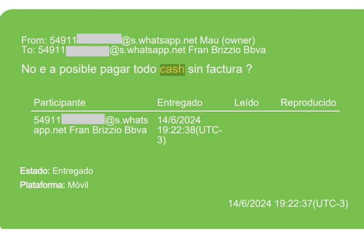 Sin embargo, pasaban los días y eso no sucedía. No se sabe si Novelli estaba mintiendo para ganar tiempo o diciendo la verdad. Lo cierto es que, de acuerdo con los mensajes, Brizio habría logrado que el hotel Faena aceptase el pago “cash” sin factura. El 2 de julio Novelli escribe: