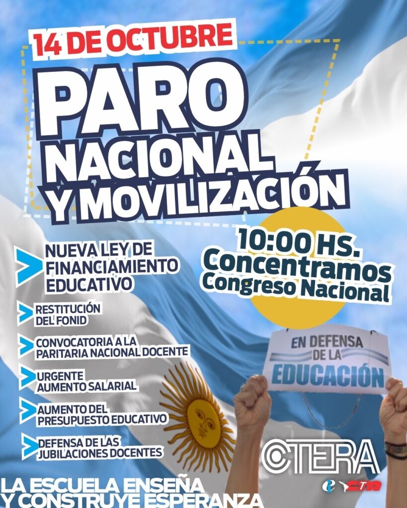 En el Área Metropolitana de Buenos Aires, la concentración será a las 10 de la mañana frente al Congreso, donde se espera una nutrida manifestación de trabajadores de la educación de todos los niveles. Entre los principales reclamos, Ctera exige la convocatoria urgente a la Paritaria Nacional Docente, la restitución del Fondo Nacional de Incentivo Docente (Fonid) —cuyos pagos están adeudados— y una nueva ley de financiamiento educativo.