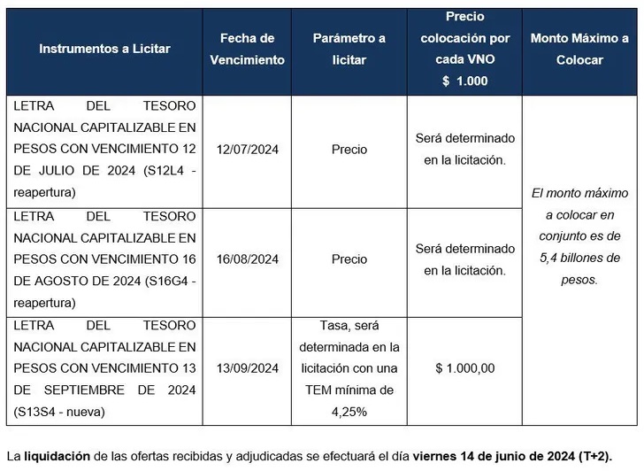En esta oportunidad, licitará tres LECAP. Reabrirá las letras con vencimiento el 12 de julio y el 16 de agosto. En ambos casos, saldrán sin tasa mínima. El rendimiento se definirá en la propia subasta a partir de una compulsa por precio.