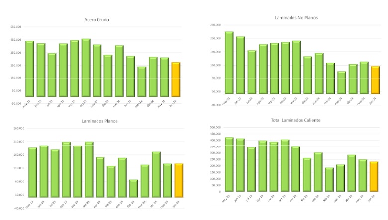 La producción de acero crudo en junio del 2024 fue de 274.800 toneladas, resultando 11.9% menor con respecto a los valores de mayo del 2024 (312.100 toneladas) y 35% inferior que en junio del 2023 (422.900 toneladas).