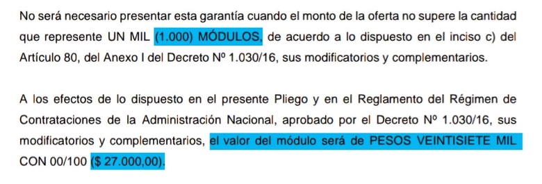 En uno de los pasajes de la apertura de licitación se desprende el siguiente texto: “No será necesario presentar esta garantía cuando el monto de la oferta no supere la cantidad que represente UN MIL (1.000) módulos, de acuerdo a lo dispuesto en el inciso c) del artículo 80, del Anexo I del Decreto N° 1.030/16, sus modificatorios y complementarios”.