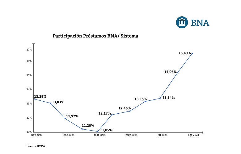 En los últimos seis meses, el BNA registró un crecimiento ininterrumpido en la participación de mercado de préstamos totales hasta alcanzar el 16,49% del share del sistema financiero argentino, según lo demuestra el recorrido por la serie temporal: mientras que en septiembre de 2023 el Banco captaba un 13,29%, declinando su posición hasta un piso del 11,05% en febrero de 2024, para posteriormente iniciar un proceso virtuoso hasta lograr el 16,49% de la actualidad.