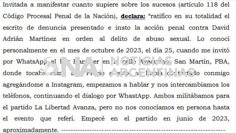 “Lo conocí personalmente en el mes de octubre de 2023, el día 25, cuando me invitó por WhatsApp al bar Hammer en la calle Ayacucho, San Martín, PBA, donde tocaba como DJ. Previo a esto, se había contactado conmigo agregándome a Instagram, empezamos a hablar y nos intercambiamos los teléfonos, continuando el diálogo por WhastApp. Ambos militábamos para el partido La Libertad Avanza”, empieza la declaración.