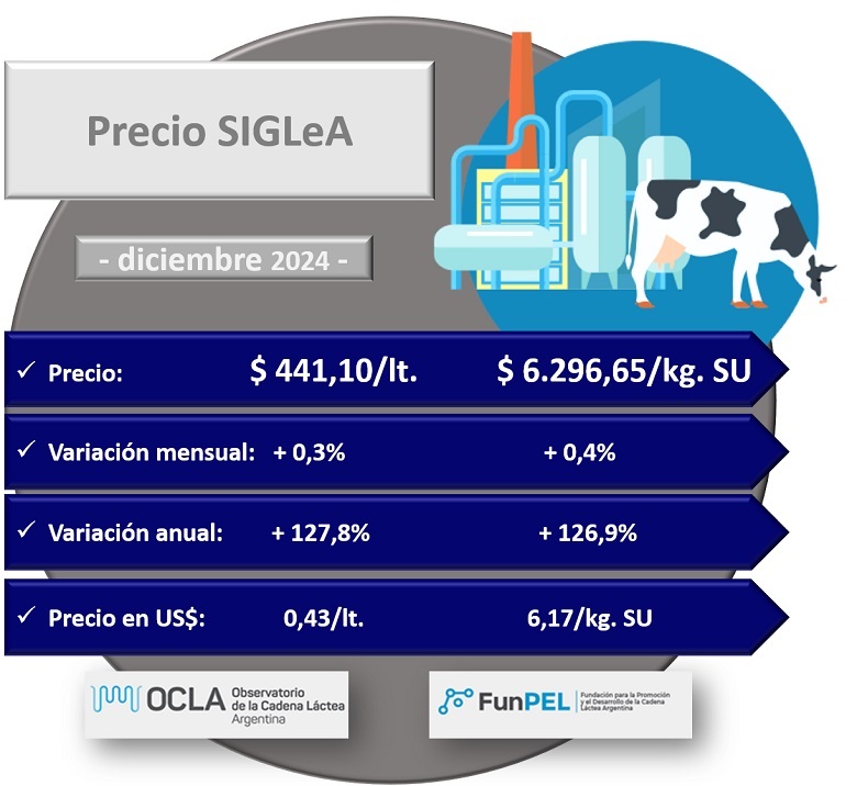 El precio de la leche en Argentina cerró el año 2024 con un valor de 0,43 dólares por litro, un incremento significativo que ha generado preocupación en el sector lácteo. Según informó el Sistema Integrado de Gestión de la Leche Argentina (SIGLEA), este sábado se comunicó que el precio promedio pagado por la leche cruda por 370 empresas lácteas en diciembre alcanzó los 441 pesos por litro. Este valor representa una mínima variación del 0,3% respecto al mes anterior, pero un aumento notable del 128% en comparación con el mismo periodo del año anterior.