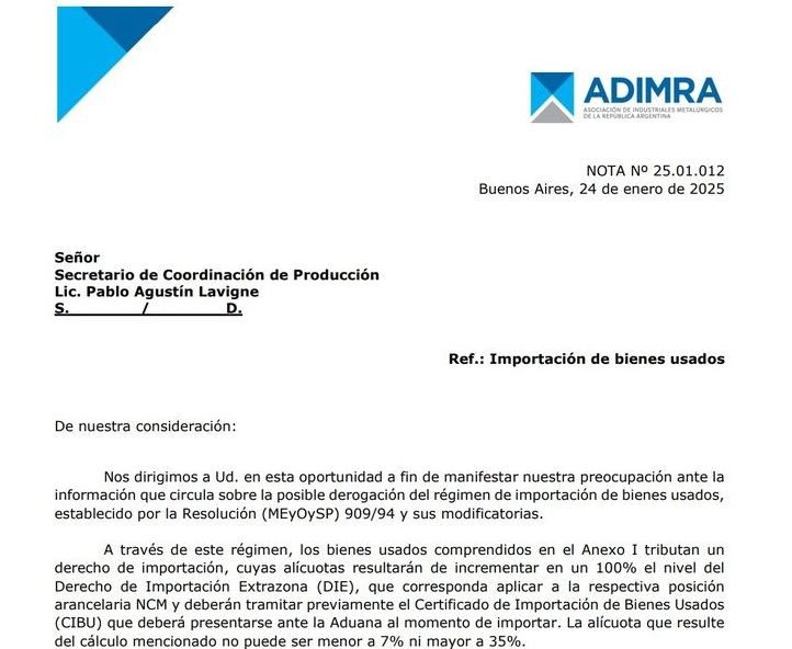 Ante esta situación, la Asociación de Industriales Metalúrgicos de la República Argentina (ADIMRA) envió una nota al secretario de Comercio Pablo Lavigne en la que expresa su preocupación por la potencial medida y pide una audiencia con el funcionario que responde al ministro de Economía Luis Caputo.