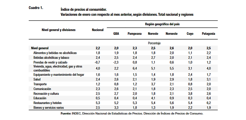 El nivel general del Índice de precios al consumidor (IPC) representativo del total de hogares del país registró en enero una variación de 2,2% con relación al mes anterior. Una síntesis de las variaciones de precios correspondientes a cada división de la canasta del IPC se puede observar en el cuadro 1.