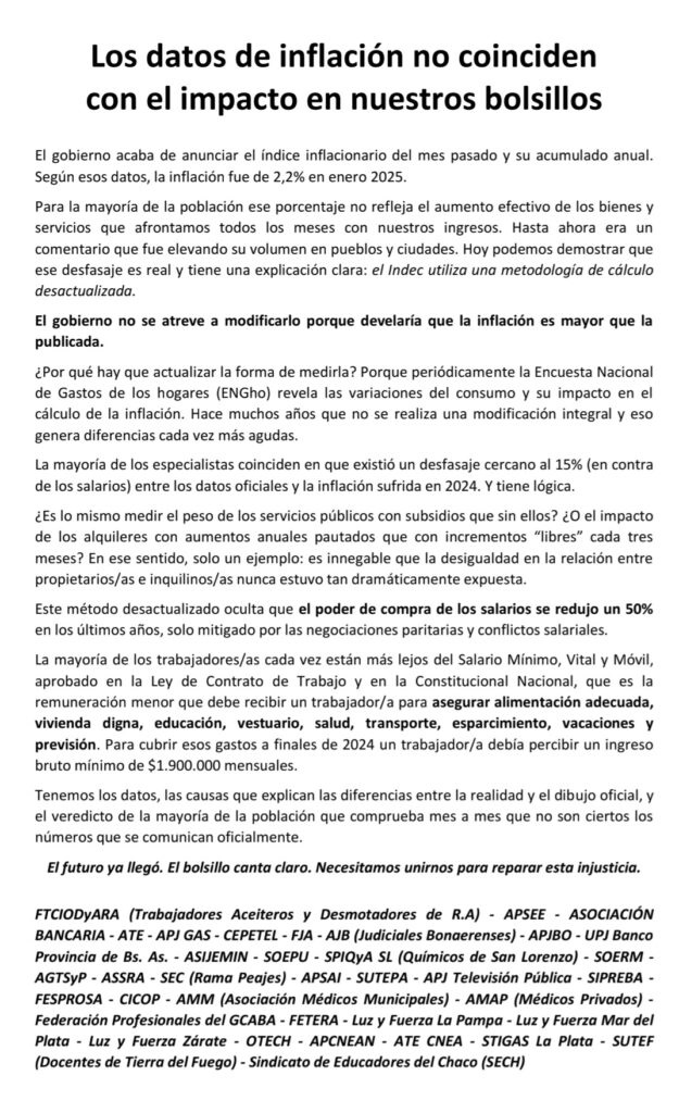 La solicitada que lleva las firmas de gremios pesados como la Federación de Trabajadores Aceiteros y Desmotadores, la Bancaria, ATE, la Federación de Judiciales, los Jerárquicos de Energía, los Metrodelegados, el Sipreba y gremios docentes entre muchos otros, señala que «La mayoría de los especialistas coinciden en que existió un desfasaje cercano al 15% (en contra de los salarios) entre los datos oficiales y la inflación sufrida en 2024. Y tiene lógica».