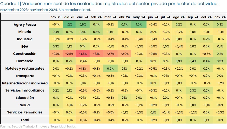 En cuanto a la pérdida de 186 mil puestos de trabajo en un año, el documento señala que esa caída llevó el número de asalariados formales a un nivel incluso inferior al registrado en noviembre de 2022 y menor a todos los valores mensuales de 2023.