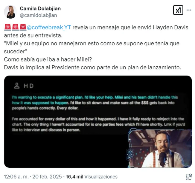 La publicación de Dolabjian en X reavivó las dudas sobre la relación entre Davis y el Gobierno. "¿Cómo sabía Davis lo que iba a hacer Milei?", se preguntó la periodista, sugiriendo que el creador del token implicó al mandatario en el proceso de lanzamiento.