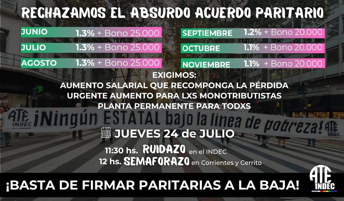 Este jueves 24/7 la junta interna de ATE INDEC* realizara un ruidazo en el organismo estadístico y luego ira al obelisco, a partir de las 12hs. , a realizar un semaforazo en rechazo a un aumento paritario insuficiente.