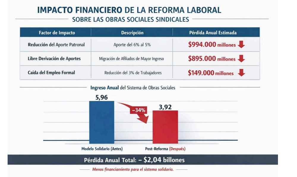 Un informe elaborado por Santiago Quintana, un Sociólogo especialista en Sistemas de Salud señala que "tomando como referencia una masa salarial anual estimada en aproximadamente 99 billones de pesos, la baja de un punto porcentual representa una pérdida cercana a los $994.000 millones anuales para el conjunto de las obras sociales sindicales". "Se trata de una merma estructural y permanente, derivada de una decisión normativa, independiente del ciclo económico o del desempeño individual de cada entidad", detalla Quintana.